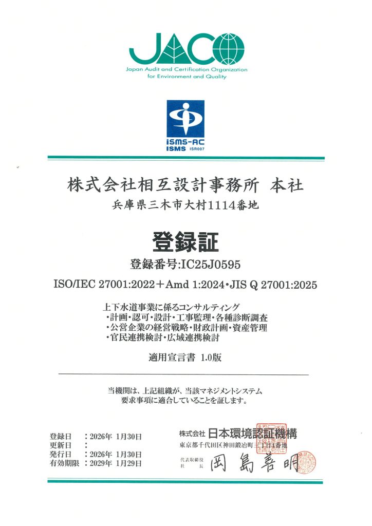 この度、情報セキュリティの国際規格「ISO/IEC 27001」の認証を本社にて取得いたしました。